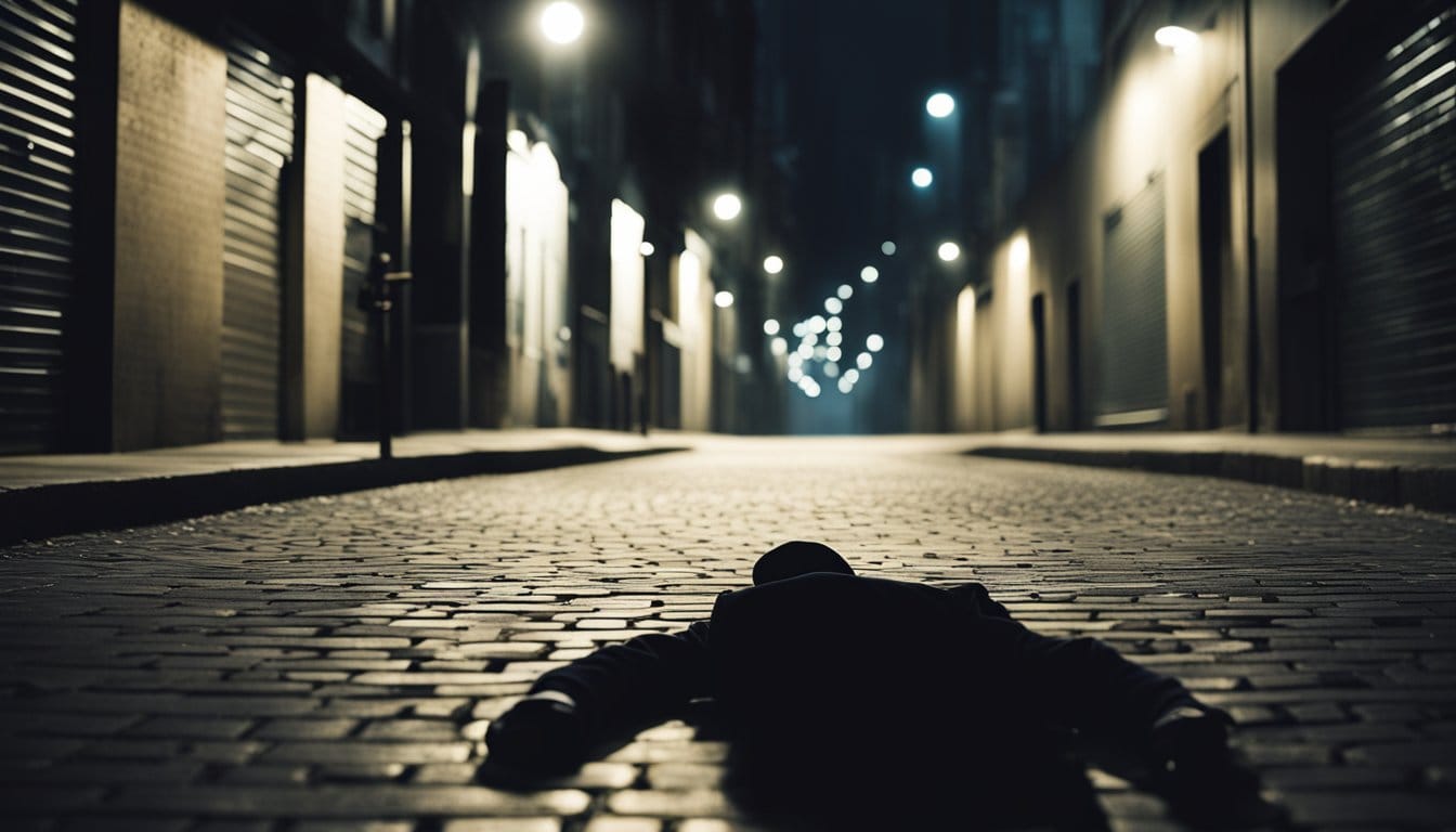A crime scene in Brazil: a deserted alley with scattered evidence, a broken window, and a bloodstain on the ground